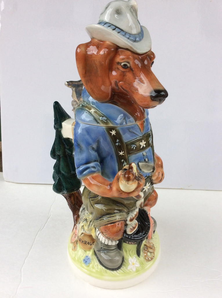 Dachshund beer stein. Relief beer mug 3D optics dachshund dog. Bavarian German beer stein, pewter lid, painted porcelain with the finest air brush technique and lid made of tin. Tin lid 97%, made in Germany. 1 Liter. L. Height 12.2 inches, width 4.9 inches, depth 6.7 inches. This beer mug is handmad inKannenbaekerland in the Westerwald. Original tradition over centuries with craftsmanship and unmistakable character. 10th addition in the man’s best friend series.